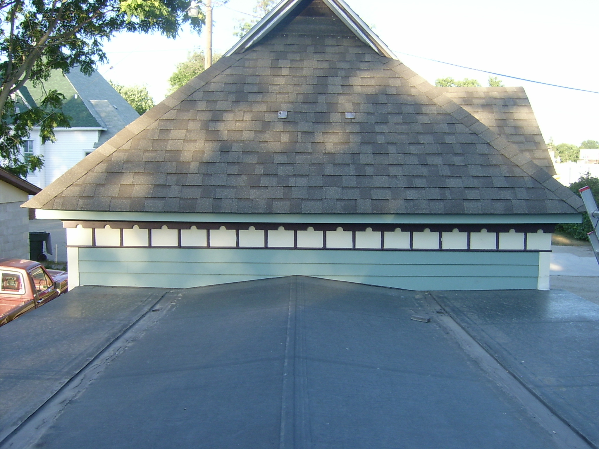 New fascia board painted with the light green color (Northwest Trail).